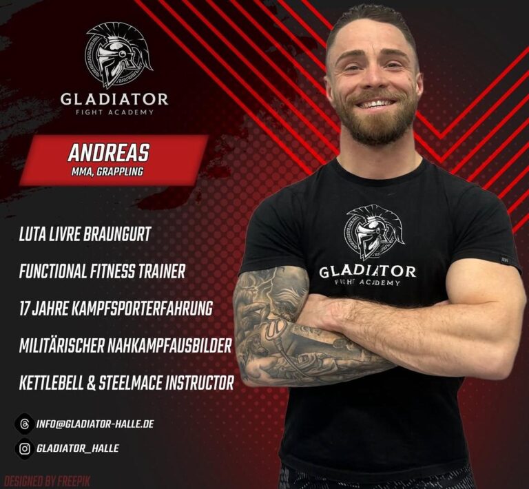 Seit 17 Jahren lebt Ande den Kampfsport und hat sich in dieser Zeit ein tiefes Verständnis für verschiedene Disziplinen erarbeitet. Sein Schwerpunkt liegt im Grappling, das er mit technischer Präzision und klarem Anspruch an Effektivität vermittelt. Als Luta Livre Braungurt unter Manuel Weilbacher bringt er fundierte Erfahrung im Bodenkampf mit und entwickelt diesen Bereich kontinuierlich weiter. Kampfsport steht für ihn für Respekt, Disziplin und ein vernünftiges Miteinander. Diese Werte prägen sowohl sein Training als auch den Umgang auf der Matte. Als Grappling Trainer in der Gladiator Fight Academy verfolgt er das Ziel, den Bodenkampf auf ein neues Level zu bringen und jedes Mitglied individuell zu fördern. Auch über den Kampfsport hinaus strebt er nach umfassendem Wissen, um die letzten Prozente Leistung in allen relevanten Bereichen herauszuholen und ganzheitlich weiterzugeben.